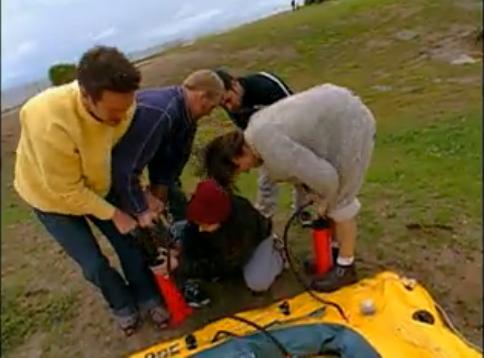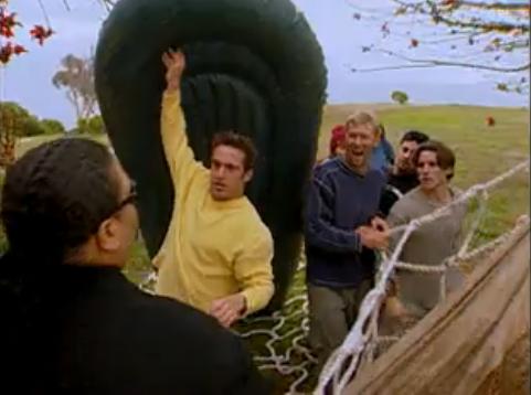 But enough of that as they go outdoors some more where they have a team building exercise. They have to blow up a rubber raft, and go through this obstacle course and carry it through a cargo net, all in seven minutes. Yeah, doesn't seem that hard. So they get all the way to the cargo net, and....