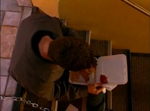 Looks like some french fries & some ribs from Tony Roma's. Yummy. So, they return to the house, and they start to converse and enjoy each others company until...