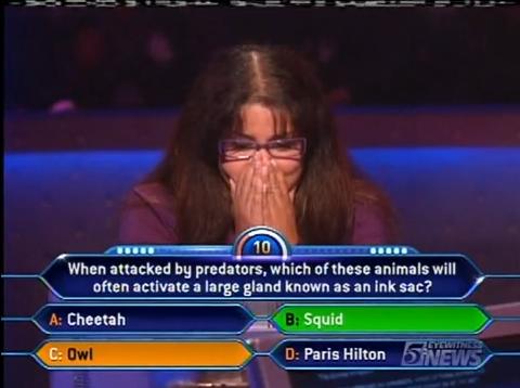 When attacked by Predators, what of these animals would activate a gland, known as the Ink Sac? Well, knowing my Super Mario Bros. lore like I do, A Blooper squirts ink and so does a squid. I don't know what gland Paris Hilton activates when attacked by predators, but she attacks us with horrible singing and even more horrible movies. But under the pressure of the clock, she blurts out C, Final Answer.