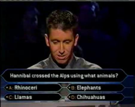 I thought this was a really easy question and that Hannibal crossed the Alps with Elephants, mainly because of their height. This was the sort of question that is answered on Are You Smarter Than A 5th Grader. But alas, Robby is struggling and uses the 50:50 to hopefully not go out on the first question. It then leaves Elephants and Llamas. He locks in Llamas.