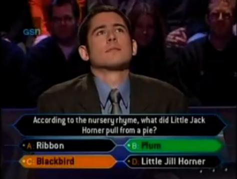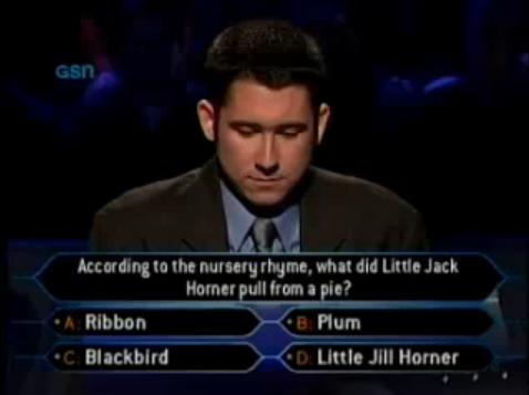 According to the Nursery Rhyme, what did Little Jack Horner pull out of a pie. Although Little Jill Horner gave me a laugh, I knew that he stuck his thumb and pulled out a plum and said, "What a good boy am I." Brian thought differently and was thinking of a different nursery rhyme and said that he pulled out a blackbird and after some thought locked it in as his final answer.