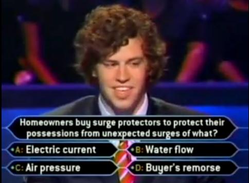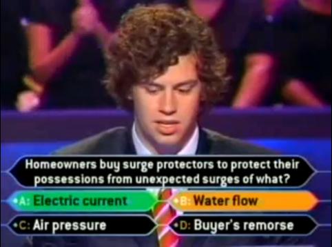 Homeowners by Surge Protectors to protect their possessions from unexpected surges of what? Now, remember what I said about Little Jack Horner & Hannibal, this is easier than that. Surge Protectors are what you plug into your wall. So, it's electrical current. So what did our sleep deprived college student say?