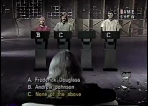 The Game itself is what drags this game down, down down. The game is a direct copy of the UK and US game show, 100%. Which, is a game show I will have to take on in the future. The show has 4 people answer random questions asked by Mr. Happy himself. He gives a statement and three choices such as..."Baseball's David Justice was once married to .......A. Halle Berry, B. Naomi Campbell, C. None of the Above." The contestants would have 3 seconds to lock in their answer. If they are correct, they earn 1 point. A missed answer or if the contestant doesn't lock in an answer within the time limit, they get no points. The game continues until a bell sounds and the person with the lowest score is eliminated from the game. How are they eliminated you ask?