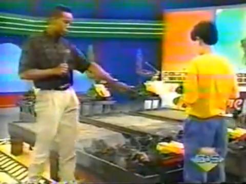 Now that's the a voice that can put you to sleep, or sounds like a college chemistry instructor. Either way, he just doesn't sound interested at all at what he does. It doesn't get much better as throughout the show, he just doesn't seem to care about anything. He keeps up with his monotone delivery and sounding like he would continue to be slaughtered by a manic baboon over and over again instead of hosting a kids game show.