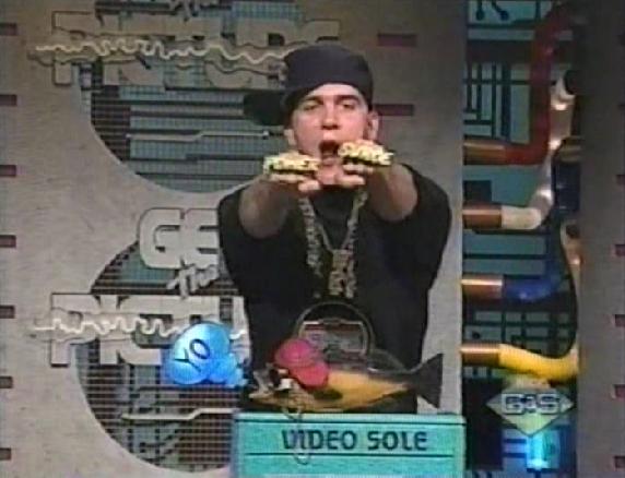 The show continues on with more facades & actual rap questions, like "ABC is a 6 man rap group who's first album was Chillin' at the Playground. What does ABC stand for?" So, the questions got less stupid, but still its still Mike desperately trying to be hip, and failing miserably. Although I didn't talk about this earlier, what the hell is up with his podium? Just because he's got a blinged up fish saying "Yo!" and called it Video Sole. I guess the person that thought up that got that from the Wink Martindale Book of Puns Vol. 2 (1983-1989). The pun sucks, but it's not High-Worthy. The rest of the game goes on like normal with more faux-hip acting questions like, "YO YO YO, name 2 of the four states of matter." It's at this time that I'm thankful that after any more damage done to my cerebral cortex, the game ends.