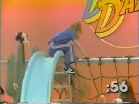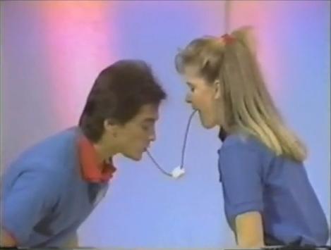 Like Double Dare, Celebrity Double Dare starts with a tossup, and unlike Double Dare, where the opening stunt is interesting, this one has the teams eating a strand of licorice until someone reaches the marshmallow in the middle. It's just boring to sit through, unless you enjoy Scott Baio sucking on your TV screen. I mean, he's an expert at sucking. Just look at Joanie Loves Chachi episodes on Youtube, he had great practice there.
