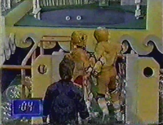 He finally tags his partner, leaving her only FOUR SECONDS! Yeah, that's great teamwork right there. She helped you out in the front game, got all of her questions right, and this is how you reward her? FOUR SECONDS???