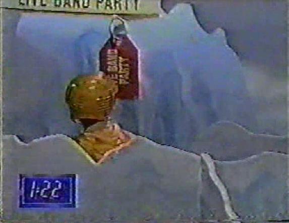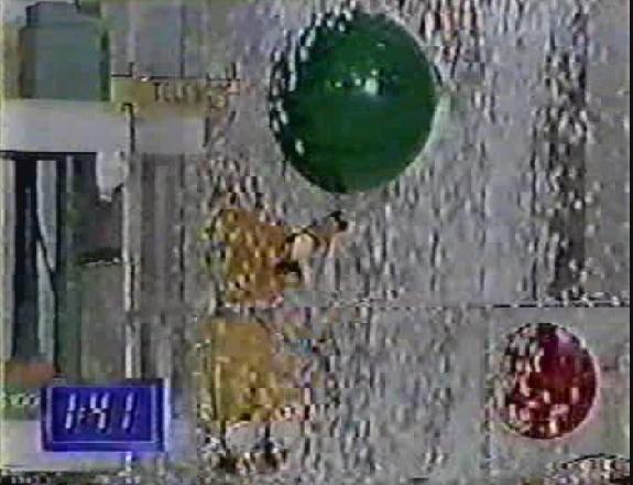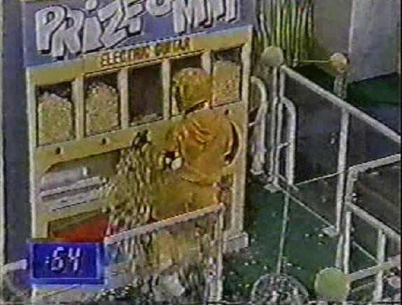 He goes through the balloon tunnel & up to the prize-o-mat and tries to grab the electric guitar prize, and got stuck because 2 buttons wouldn't release, which happens from time to time. At this point, he's spent about 1:10 in the house. Which in itself is far too long for one contestant at one time. He then finally decides that it's time to grab some tags...