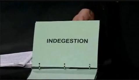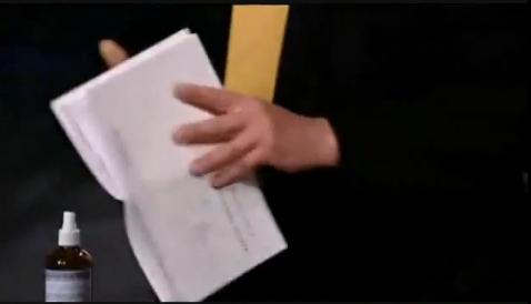 Next, he uses the cheapest form of props in the world, pieces of paper and a binder just flipping what his water cures. What's notable about this is his lack of proper spell-check with such misspellings of Indigestion, (he spelled it Indegestion), and bad or poor Prostate (He spelled it Prostrate, which both Arlene Dickinson and Brett Wilson both pointed out).