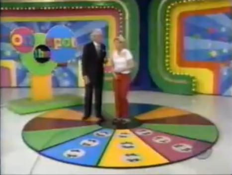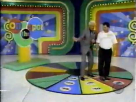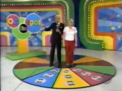 First, let's take a look at the set up for On The Spot. I don't know who designed it, but I think their idea was to take all the colors that were available at the local Paint store, make each section one color, so that it is all gravy for everyone to have their favorite color on a pricing game. In a word, Ugly. In two words, Butt Ugly. If you look closer, it kinda looks like a Wheel of Fortune prize podium, without all the dollar amounts, and if it had a few less wedges, but aside from that, it's the same.