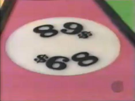 Another Eyesore is the identification of the prices. I don't know who thought this was a good idea for those to look like the way they do, it's just an eyesore. Plus, the contestant can't tell if it's $31 or $13 or $72 or $27. Especially in this case, $68 or $86. Bob had to tell the contestant it was like that for the camera to pick up which price it was. It just reeked of bad design all around.