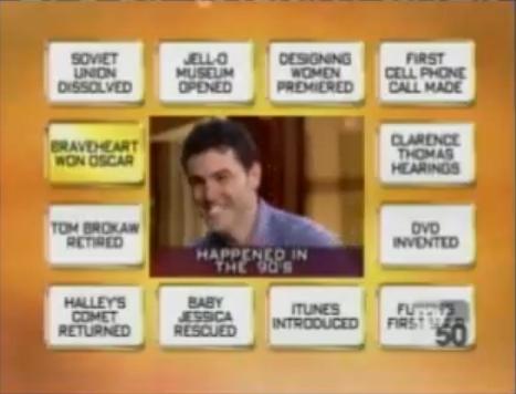 For more cheap effects, you get this pathetic countdown clock. It just doesn't have the same oomph and feel that Jim Perry's line does. After this, we have Ripoff moment #2...The Fame Game. Now, the old Fame Game would have Jim reading a small bio about a person, place or thing in the third person The first person that would buzz in with the right answer gets a pick at the fame game board. What happens in this version?