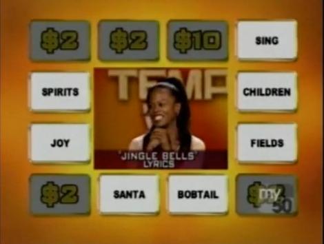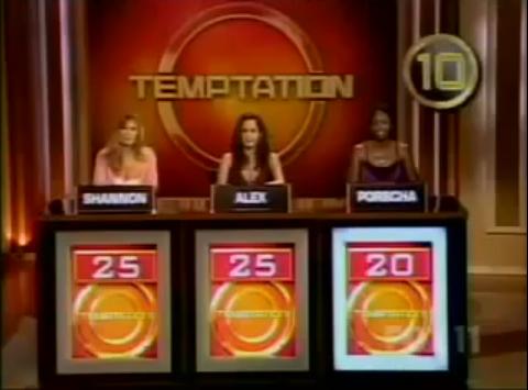 They rip off Wheel Of Fortune's Toss-up Puzzles with letters appearing on the board while Rossi blandly reads off facts. The first person to solve the puzzle wins 15 temptation dollars. Ugh, I don't want to continue anymore. I need a commercial break.
