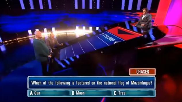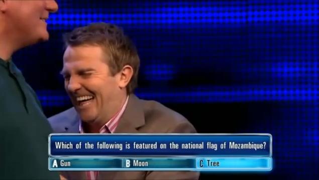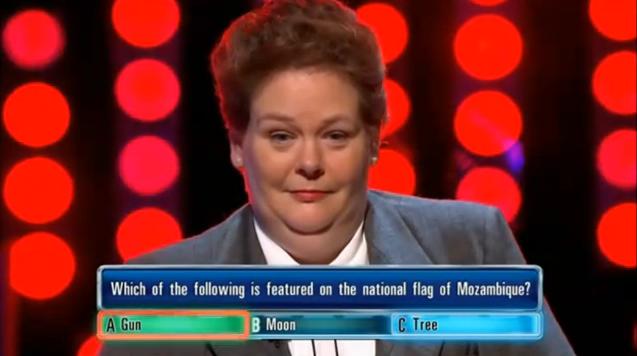 featured on the national flag of Mozambique?" Now I don't know this one. I know absolutely nothing about the flags of African Nations.
