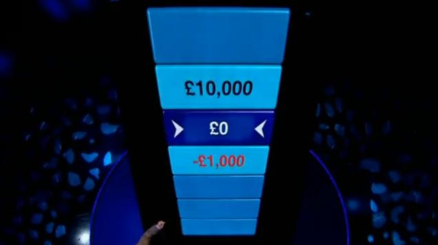 The money, or in this case lack thereof, would be put three steps ahead of the Chaser. The Chaser will offer a low-ball amount to go one step closer to home base but will give a huge offer, many times triple or more than what they earned in the first part of the game. Now since Keith earned 0, The Chaser had to offer, in a rare occurrence in itself, a Minus offer in -1,000 pounds. She prefaced that the 1,000 would be taken out of the prize fund of the next person, provided they make it to home base. The big offer she gave to put him closer to the chaser, as she put it "Since you were asked 10 questions and got them all wrong...10,000 Pounds." So, without hesitation, he takes the 10,000 offer, so he could at least gain some credibility. Now the rules, the Contestant and the Chaser will be asked the same multiple choice question and lock in their answers. The first person to answer puts the other one