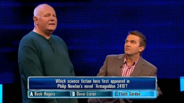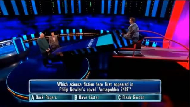"Centerfield Nuclear Power Station is located in what county?" He quickly says North Umberland before realizing his mistake and starts to say Cambria, when Bradley starts to say it as the correct answer. So, out of the 5 questions he's missed, he should at least have 2,000 pounds right now. Immediately afterwards, he misses a question about The Railway Children, wastes about 8 seconds on a Dick Van Dyke question and a question about the song, Hello John got no motor?. So, we're already 8 questions in, about 12 seconds left and no pounds in the prize fund.