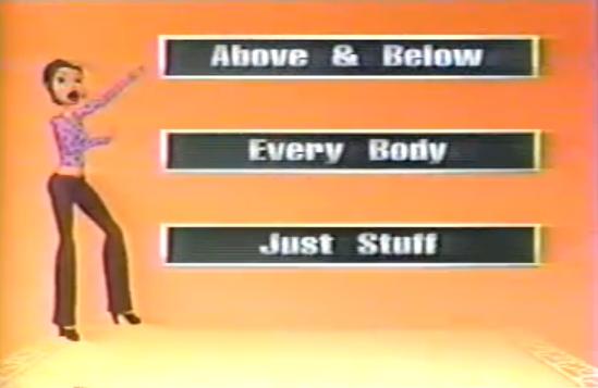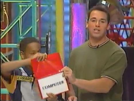 The host of this show was David Sidoni. I don't really have much bad to say about him, although he could tend to get annoying at times. But he's a capable host, which is proven when he also hosted Mad Libs. For a kids game show host, he's alright. He genuinely roots for the kids to win and is excited for when they do well and is sympathetic for when they don't do well. Unfortunately, he's hampered by this freak of nature.