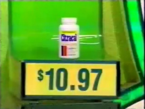 $9.50. She then gets the rundown of the grocery items, such as Brut Splash-on Lotion, Garlique tablets, Absorbine Jr. Pain Relief Patch, Geritol tablets, Jungle Fever face powder & a big thing of Citracal Calcium tablets. Bob then asks her for the first pick and she goes with....