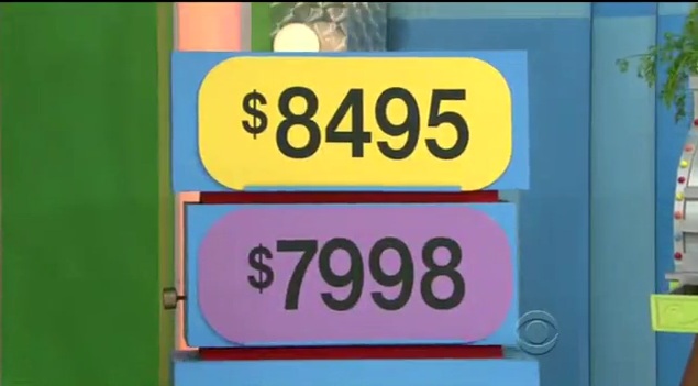 But anyways, she's playing Double Prices for a pair of motorcycles. Drew points out that her boyfriend rides motorcycles, so it should be perfect. She had prices of $8,495 and $7,998. Now the obvious choice is that since it's a pair of something, the last number should be an even number, like an 8. So what does she do, with the egging on of her boyfriend?