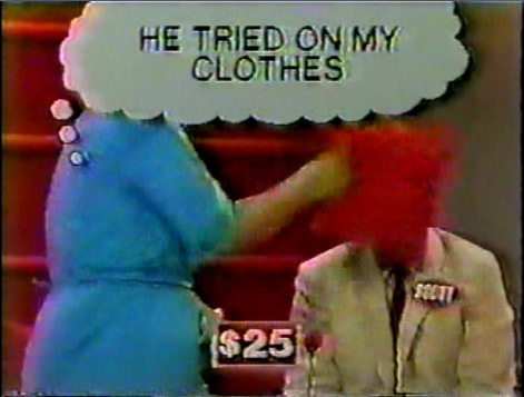And to help out with said arguments, pillows are used to help to heighten the "excitement" factor of said argument. I guess when you hit someone on TV, it's funny. I mean, look at Pictionary and the infamous Bill Maher/Erik Estrada incident. I mean, everyone was in stitches when that small thing happened. But here, it just seems forced. I bet Sternberg at least told the contestants that if they got it wrong, have an argumentor hit them with the pillow. It always happens. Heck, even The Newlywed Game didn't make it that blatant, even with Bob's prodding or Paul's somewhat lame jokes and even Carnie's perversiveness didn't cause arguments like this to be turned on at the stroke of stupid.