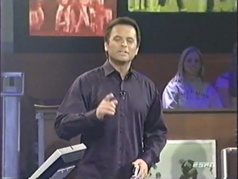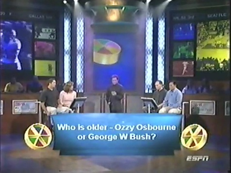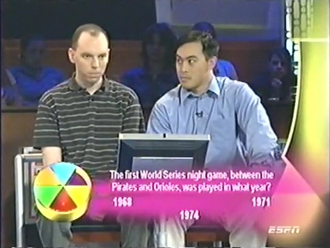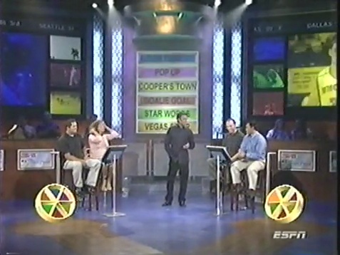 The first Trivial Pursuit set had a really beautiful set. Unfortunately, ESPN went really cheap. They decided to house this show at their ESPNZONE place in New York. And using the monitors they already had there, they just had two sets of chairs with a computer monitor. Yeah, already we can see with the set that they really didn't care that much about this show, it was just pure filler just so Jim Rome could get healthy or they could just fill it with something else. Not to mention the theme music was just generic background music with a really annoying Oh Yeah! added to it. Heck, hearing that made me want to channel my inner Macho Man Randy Savage and elbow-drop whomever came up with that idea.