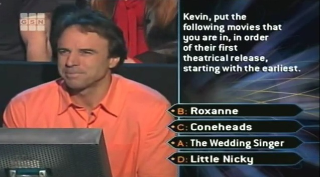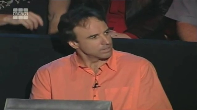 Before I do that, I have a hilarious craptacular moment to share with you. Fans of Saturday Night Live might recognize this man as former host of Weekend Update and regular in Kevin Nealon. He appeared on Millionaire during the never-ending celebrity specials that plagued the show after 9/11. During this week, Kevin has had his share of difficulties with the Fastest Finger questions that popped up during the 5 weeks they had done the Comedy Specials. So, at the end of the specials, it was all up to him. He was the only person left. Rules state that he MUST get a fastest finger correct in the fastest time in order to get into the Hot Seat. So, he now faces his fastest finger question.