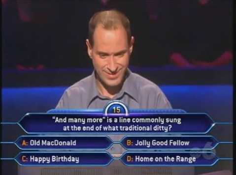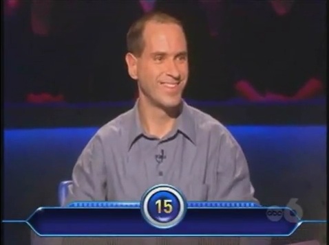 We start with Kevin. I don't know his last name, but that's because I couldn't find it. I bet there's some website dedicated to Millionaire that has all of the data on all the shows, but who knows. Anyways, before the game starts, Meredith tells him to keep his pants on. I'm assumign during the interview, he told a story about losing said pants. In a word, meh. He gets the $500 question quickly, but then he gets to his $1,000 question.
