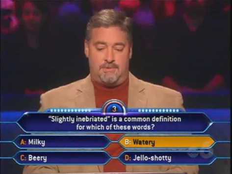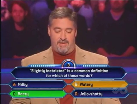 Like this one. He would have asked the audience or something to help him out. But since the clock cuts down on pretty much everything, he's forced to select something. But if he had to select something, he should know that Beer is an alcoholic drink.