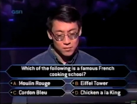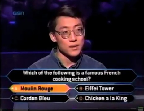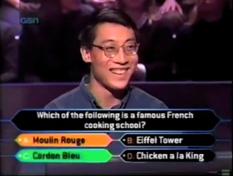 Unfortunately though, his gut failed him and it was Cordon Bleu. Now, even though Regis said that he went back down to $200, but he did become the 6th person in the shows history to leave with absolutely nothing. He would return for the $0 Winners special next year, but unfortunately for him, he didn't even get out of the ring of fire. I don't know about his medical career after this show, but I bet he did get a DVD copy of Moulin Rouge directly when it came out.