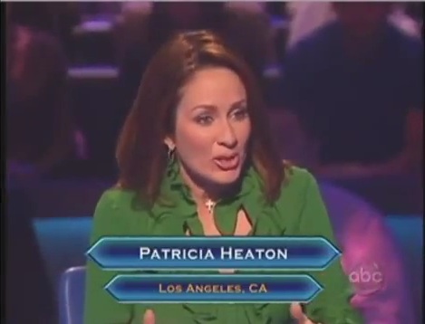 After all of that, Patricia sounds like she has given up, thank god. Saying, "I'll throw in the other $25,000. Especially if I don't have to tell you how many nickels it is." It shouldn't come as a shock to all that the audience cheered loudly after she said that. After hearing all that whining and complaining about the question, it was finally the most positive thing she said about the question. However, one thing about this. She forgot that she isn't against a timer and she can still answer the damned question. Regis had to drill this into her head so that we could finally get this damned thing over with.