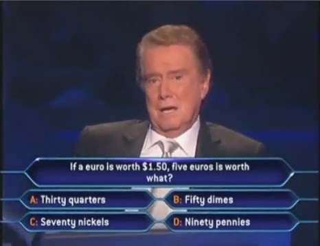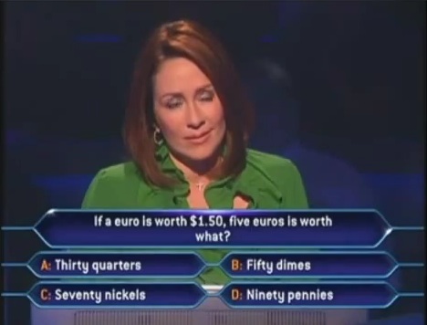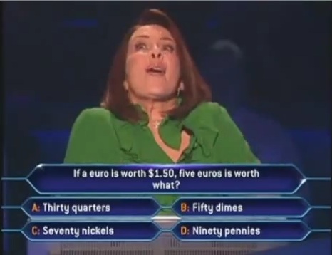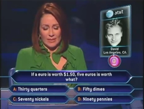 After about a minute of whining, she finally decides to use her lifeline and calls her husband, David. The audience is relieved. I am assuming they haven't heard that big of a breakdown since 2004 when the Yankees lost 4 straight to the Boston Red Sox in the ALCS. Patricia exclaims that he is from Europe and knows about the Euro. So, with that in mind she's hoping he would know the answer so she didn't have to do basic 4th grade math.