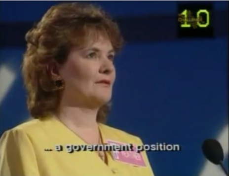 Here he is with Les and he's in a perfect position. His partner got 175 Points and 3 of the 5 top answers. I mention the top answers because in this version, starting with the 93-94 series, a new rule was enacted for the bonus game. The rule is that if the family gets all 5 top answers and reaches 200 points, not only do they win the big money but they also win a brand new car. Just for edification and how to actually play it; here is his partner, Heather, playing the first round.