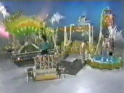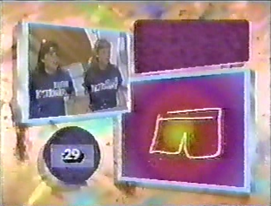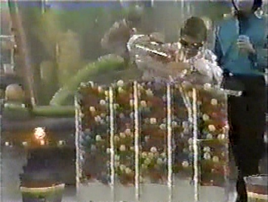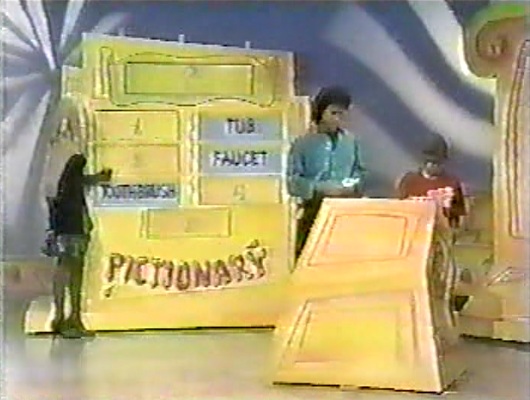 By Felicity turning a knob and colored ping pong balls would fall into a container up to the point marker. Why couldn't' they just have put two monitors where the contestants were. I mean, this was Barry-Enright. They were famous for bringing computer technology into game shows with Tic Tac Dough and Hot Potato and Bumper Stumpers. This was just pathetic. Another gripe is the telestrator itself. Sometimes the background that they have up for the round distracts from the drawing itself and makes it almost impossible to decipher. This would have been so much better with just a regular pad and pens.