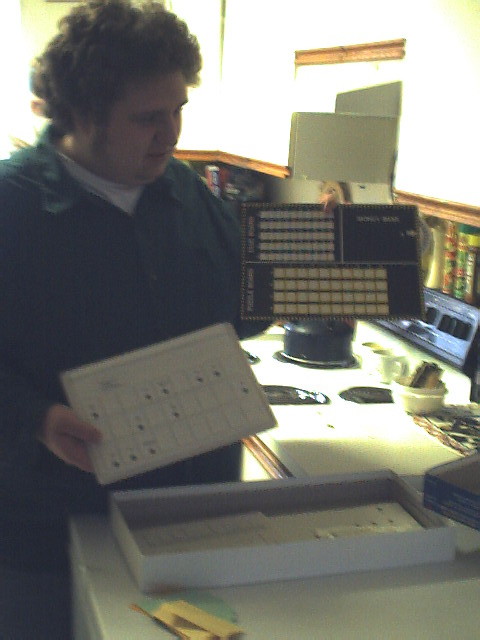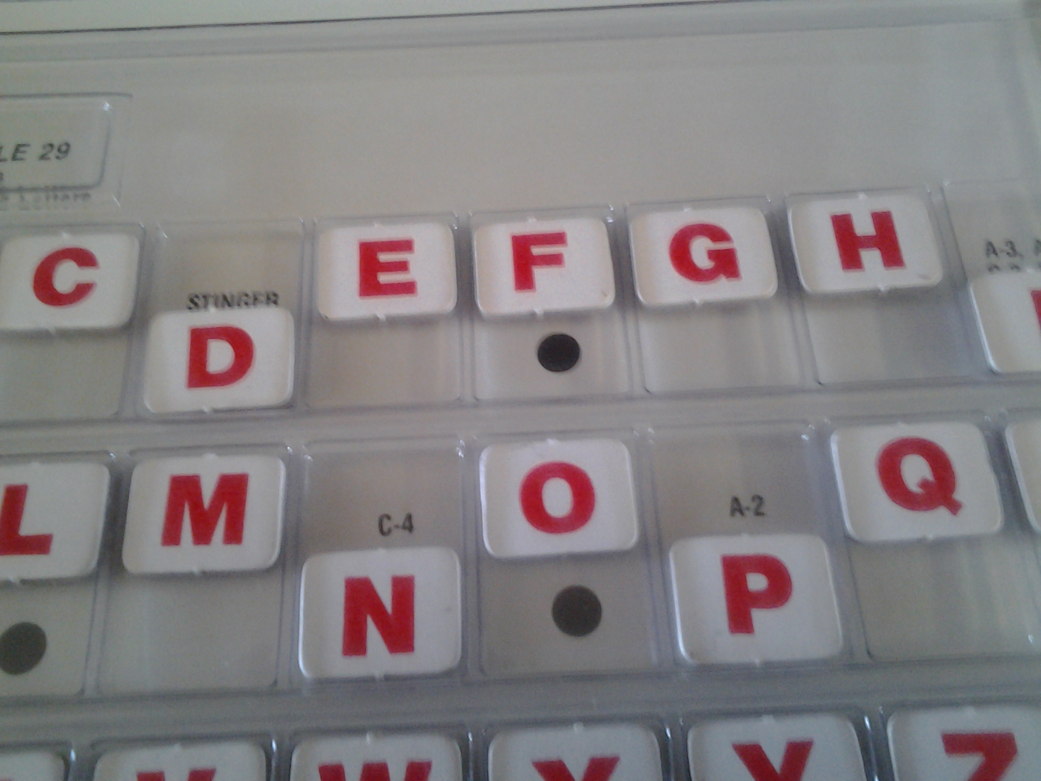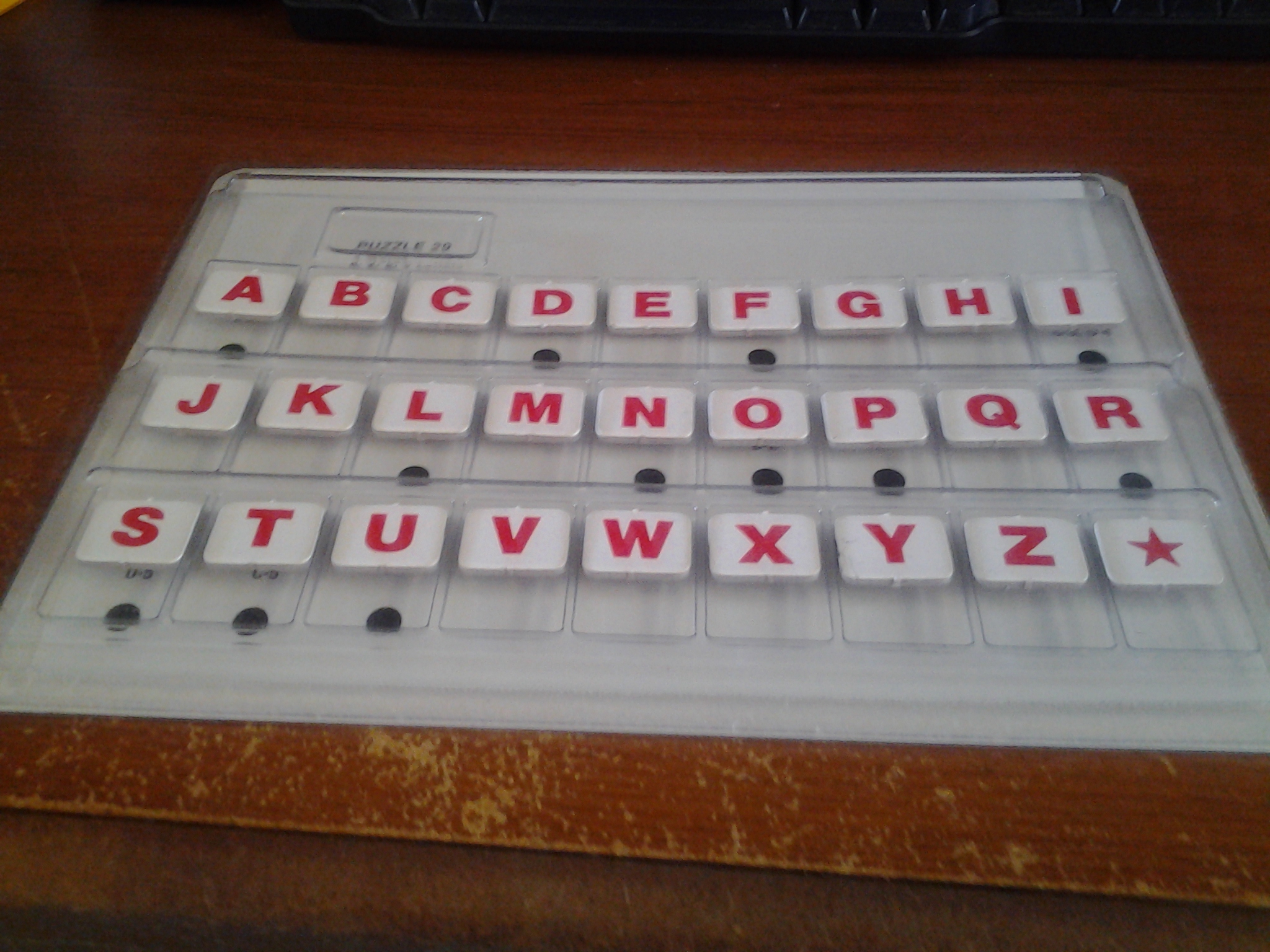 This was supposed to be the keyboard looking device. What irks me about this was how cheap it was. On the back of the box it had it as one solid device, kind of like the puzzle board for Wheel of Fortune. But here, it's 27 separate pieces you have to keep track of. Lose 1 and you won't be playing this game at anytime, because the people playing will know where certain letters are.