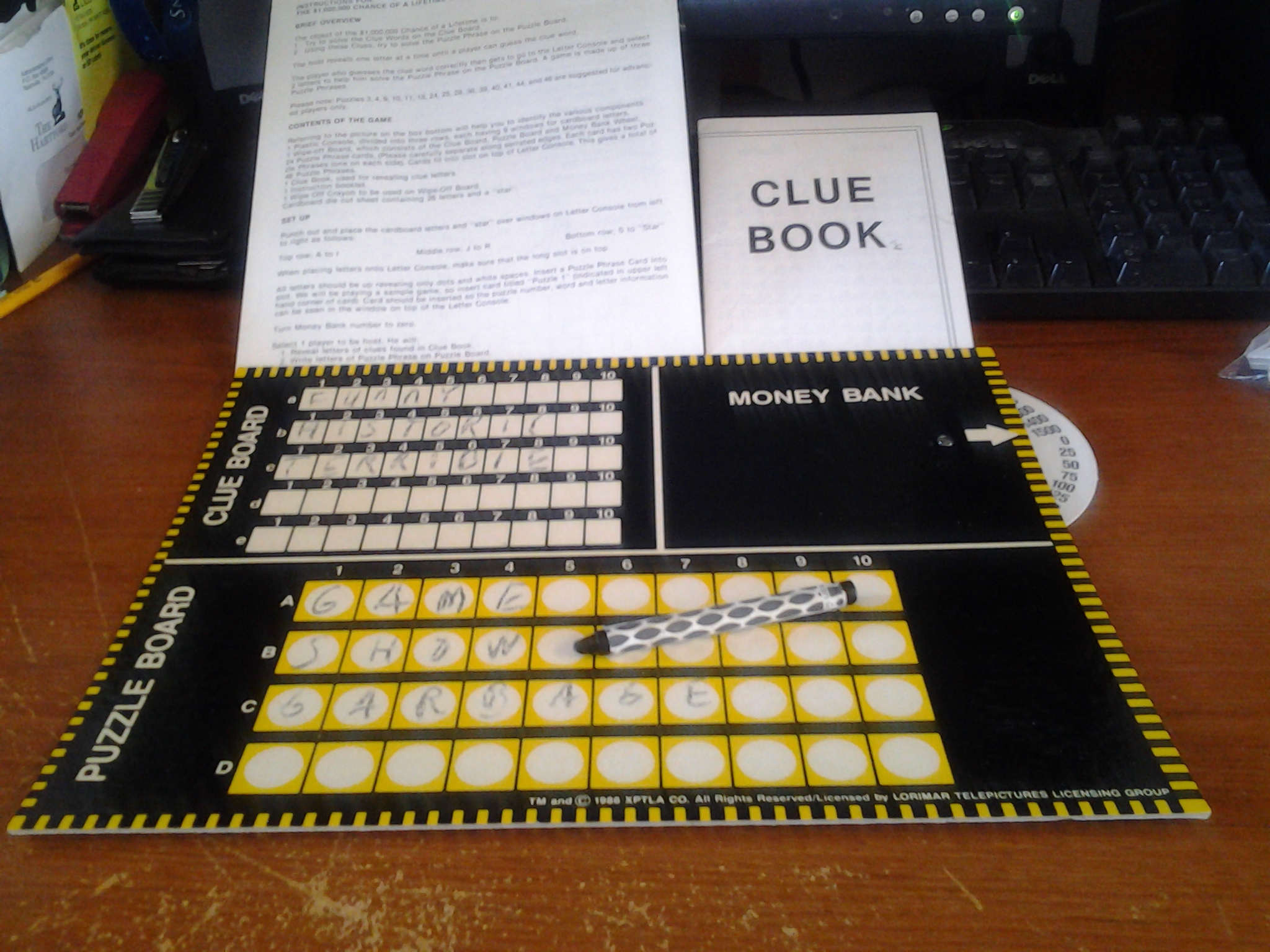 Well, for starters you don't retain any of the elements that make the game popular. There's no gigantic keyboard, there's no isolation booth and there isn't even a $1,000,000 thing to give away. What we have here is a rectangle board with a bunch of blanks on it to fill up, a black crayon to mark it with, the instruction book, and this.