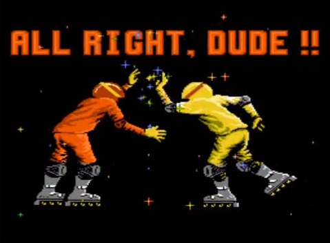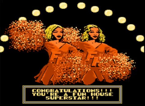 So after 72 levels of torture and broken controls, you are treated to your character running through the fun house and getting to the top. If you want to nitpick even more, it's all based on the FOX Fun House, which is the lamest of them all. The actual ending has just three screens. The first one has two nondescript contestants high-fiving on rollerblades with "All Right, Dude!" with fireworks or whatever the hell it is. Then you finally see the cheerleaders who look like they've been deformed with a small text box saying that "Congratulations! You're a Fun House superstar!" I know the NES wasn't known for spectacular endings early on, but this is 1990, you had the bar raised by Ninja Gaiden, Mega Man 2 and 3, Super Mario Bros 2, and others. The ending here looks absolutely pathetic and poorly done.