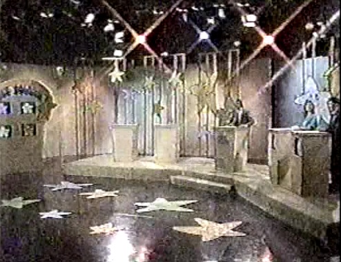 We'll start off with the first thing you see and that's the set. Now, I really don't expect greatness from pilot sets, but at least they should look appealing to the eye, otherwise you're not going to get people to sit down and watch this show. I mean, the stars around the set look like they were designed by someone who had way too much caffeine and they just look stuck to a bland white set lit up by colored background lights. The only interesting thing they have is a set of monitors on the left hand side of the set to show the answers to the personality questions they have asked the celebrities and for the contestants to answer, but it just looks like the monitor cluster from Double Talk with the fifth monitor ripped out. This really isn't shaping up to be a worthwhile pilot at first glance.