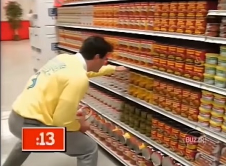 Before we continue on with how Jeff's shopping list trek went horribly wrong, I want to talk about some strategy about the Big Sweep. Myself and Jessica Brand spent some time discussing the best way to spend the 1:40 in the Market. Both of us agreed that you need big ticket items that don't take up too much space in your cart. That means, raiding the health and beauty aid section. Getting tons of eye care products, hair coloring, bottles of Tylenol among other items would help out. Then head on over to the next aisle over to get some pots and pans and pails. Those are other big ticket items that won't take up space since you can stick all the pots and pans in the garbage pails. If there is any time left, then go to the deli and grab the salamis and blocks of cheese. In the 1991 season, that should net you roughly $500-600. There are instances where that is enough for a win, but it would save you any embarassment.