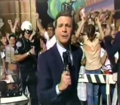 We open the special outside of a studio to a crowd chanting for Hervé