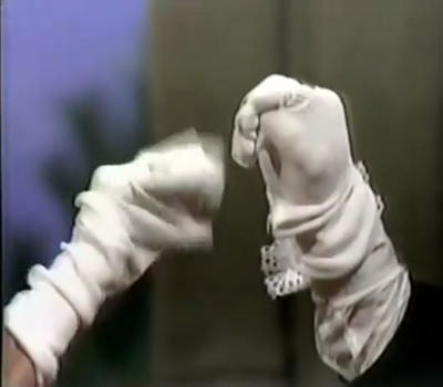 been to put on them socks. At least this puppetry shtick actually ties