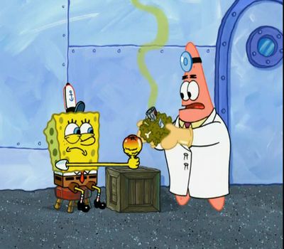 before spraying puss all over him. Spongebob's thumb is healed, and he